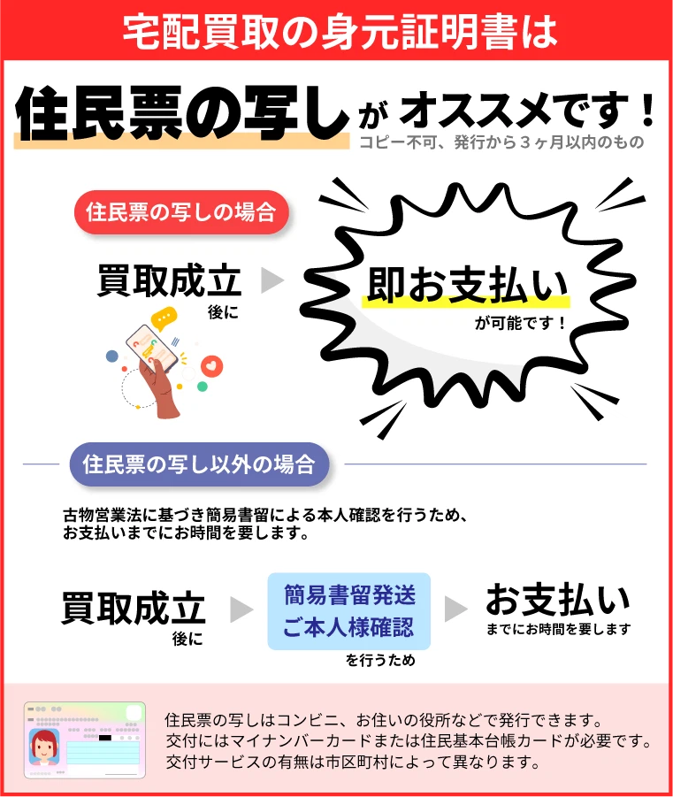買取のお手続きには、ご在住の住所が記載された身元証明書のご提示が必要となります。